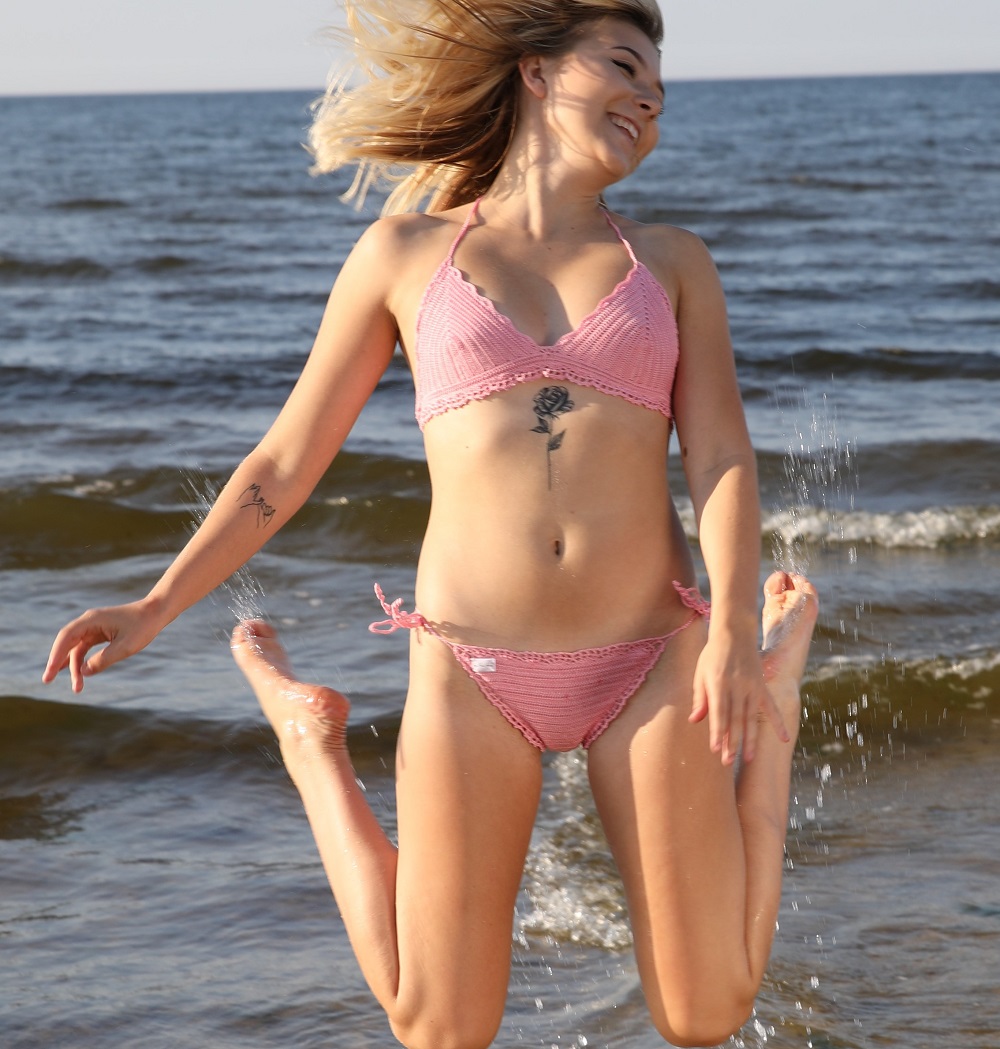 Niecodzienny i unikatowy strój plażowy bikini, do opalania. Wykonany ręcznie z bawełny techniką szydełkową.