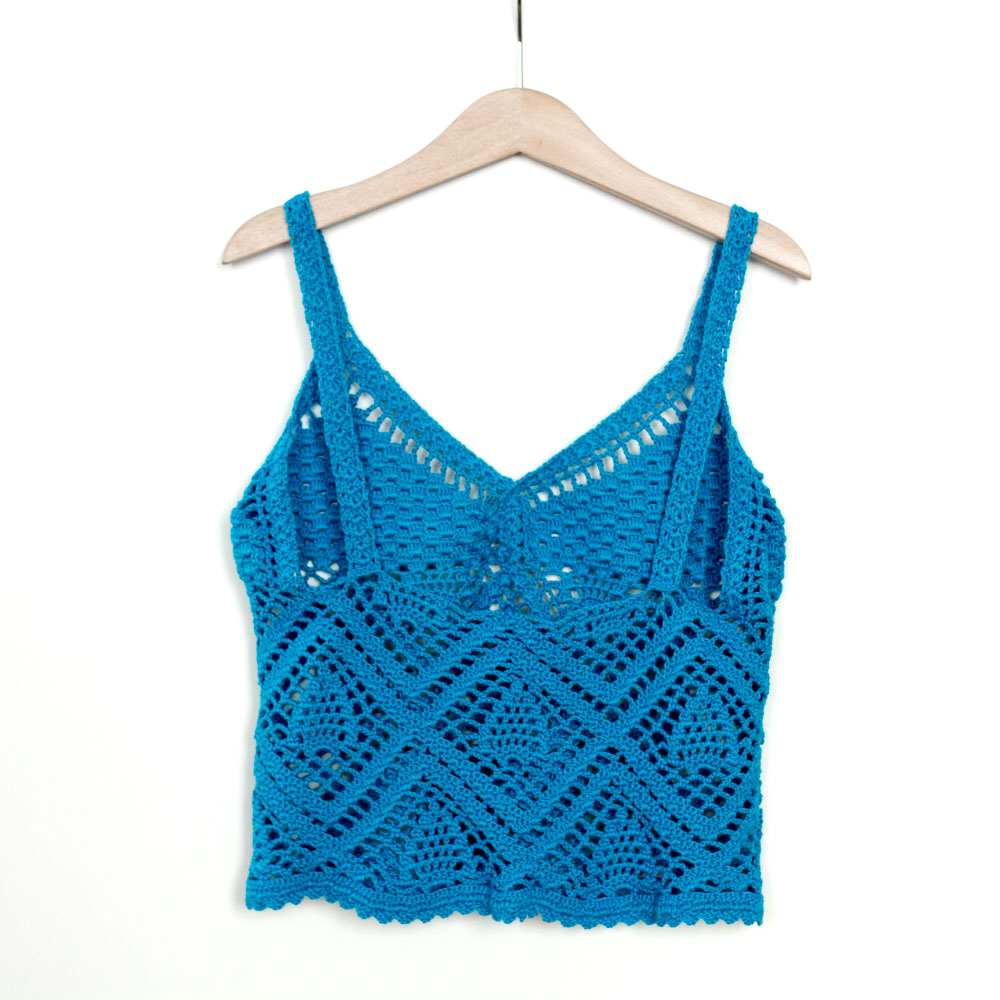 Letni top w kolorze turkusowym został wydziergany ręcznie techniką szydełkową.